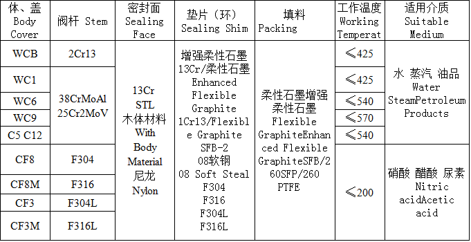 5、閥體、閥瓣、閥杆、填料、緊固件的材料可按實際工況要求合理選配,以适用於多種不同的工況環境。