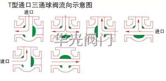 T型三通球閥适用於介質的分流、合流或流向切換,可以使三個通道互相連通或使其中兩個通道連通,流向圖中1和4兩種工況可選用兩閥座T型結構,2和3兩種工況必須選用四閥座T型結構,其餘工況也可選用四閥座結構,在選購時必須注明。