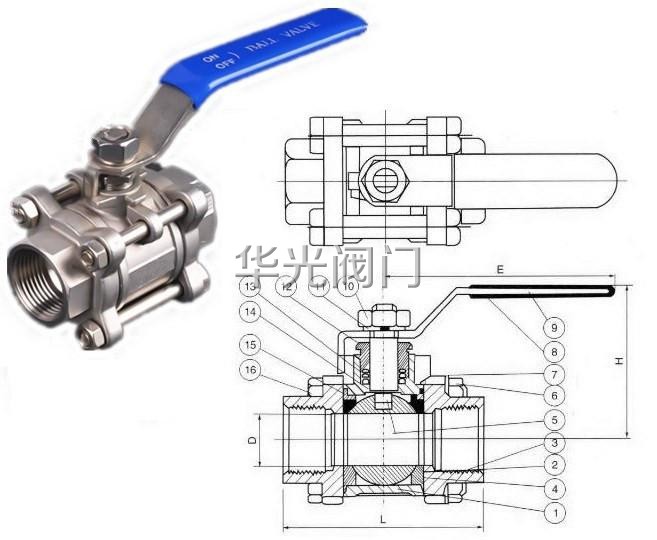 Q11F-16-64P不鏽鋼三片式絲口球閥主要零件材料: