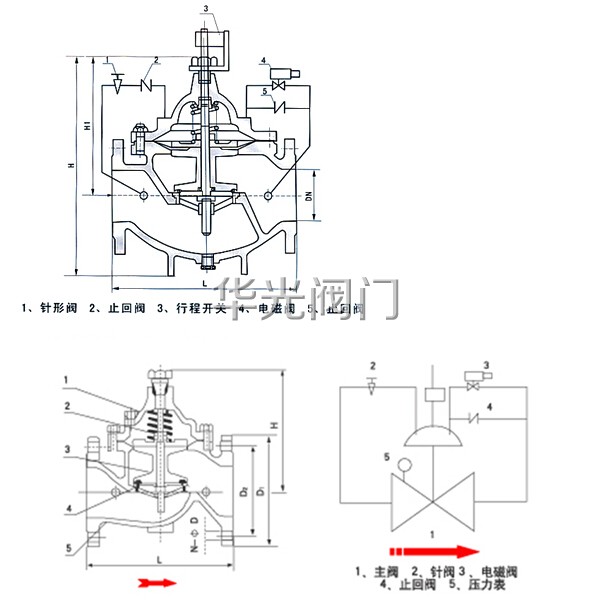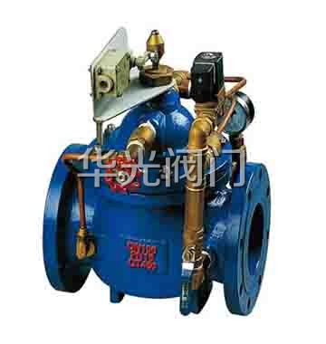 當水泵工作閥門向下遊供水時,電磁導閥全開,針閥調至适當開度,上遊水經針閥、單向閥進入主閥控制室,經電磁導閥流出,此時主閥控制室的壓力保持主閥處於合适的開度,保持下遊正常供水。 當水泵停止工作時,電磁導閥先關閉,主閥控制室停止排水,控制室壓力升高,主閥開始關閉。當關閉至90%時,主閥上部行程開關輸出停泵信号,水泵停止運轉。此時下遊回水經單向閥進入主閥控制室,控制室壓力升高,主閥被關閉。