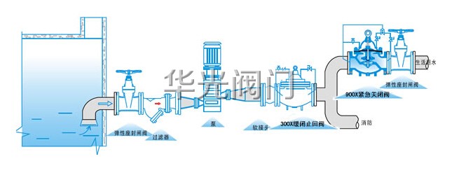900X緊急關閉閥是一種用於消防用水與生活用水並聯的供水系統中,用來調配供水方向的閥門。當火災發生時,消防急需大量用水,900X緊急關閉閥立即切斷生活用水,確保足夠的消防用水:當消防停止用水壓力減小時.閥門自動打開,呈常開狀态,恢複生活供水。該閥使系統無須另設專門的消防單獨供水管網,大大地節約瞭建設成本和用水量。閥門控制靈敏度高,安全可靠,調試簡便,使用壽命長。