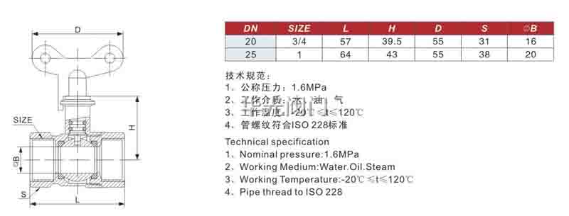 | 技術規範: | 公稱壓力:1.6MPa 工作介質:水,氣體等 工作溫度:-20℃≤t≤110℃ 管螺紋符合ISO 228标準 |