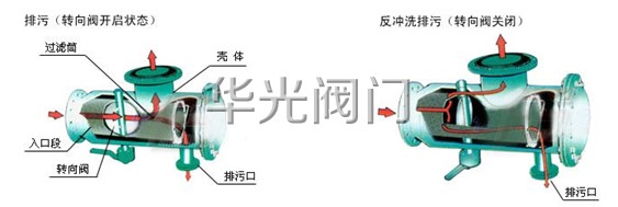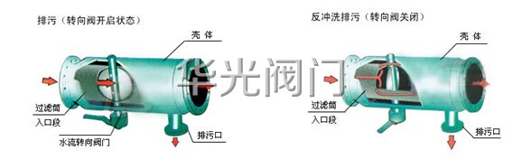 反沖洗時,水流轉向閥爲關閉(bì)狀态,排污閥開啓,這時水流被迫從過濾網筒的入口段網孔進入過濾筒外側與殼體夾層,反向從網筒外側沖洗粘附在網孔上的雜質,達到清潔過濾網的目的。由於(yú)轉向閥關閉(bì),水經過反沖閥後流帶增大,反洗效果好。