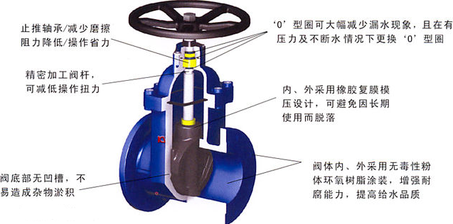 平底式閘座:傳統的閘閥往往在通水洗管後即因外物諸如石頭,木塊、水泥、鐵屑、雜物等淤積於閥底凹槽内,容易造成無法關閉緊密而形成漏水現象,彈性座封閘閥底部採用與水管機同的平底設計,不易造成雜物淤積,使流體暢通無阻。