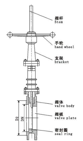 暗杆刀形閘閥:(又名刀閘閥) 刀型閘閥的啓閉件是閘闆,閘闆的運動方向與流體方向相垂直,手動刀型閘閥隻能作全開和全關,不能作調節和節流。暗杆刀形閘閥具有結構簡單緊湊、設計合理、輕型節材,密封可靠、操作輕便靈活、體積小、通道流暢、流阻小、重量輕、易安裝、易拆卸等優點。