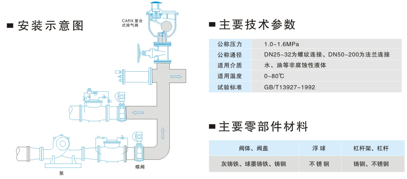 複合式排氣閥的外形爲圓筒狀,主要用於管路上的*高點或有閉氣的地方,排除管内的氣體來疏通管道,達到正常工作,如不裝排氣閥,管内流動的液體産生動熱引起氣體,形成短路,使管道出水容量達不到要求,其次,管道運轉時出現停電、停泵管道會出現負壓力,而會引起管道振動或破裂,排(吸)氣閥就迅速把空氣吸入管内,防止管道振動或破裂。