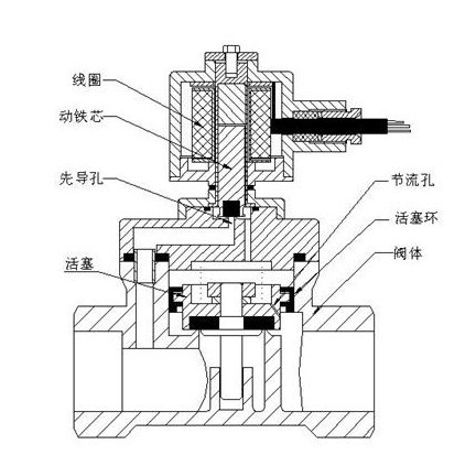 先導式電磁閥工作原理:常閉式---通電時,電磁力吸合先導孔閥芯,先導孔打開,主閥活塞上腔壓力下降,在主活塞上腔和下腔形成上低下高的壓力,這樣下腔壓力推動主活塞打開閥門;斷電時,彈簧力複位關閉先導孔,主活塞上腔增壓,在主活塞上腔和下腔形成上高下低的壓力,介質壓力和彈簧力推動主活塞,閥關閉。常開式與常閉式相反。