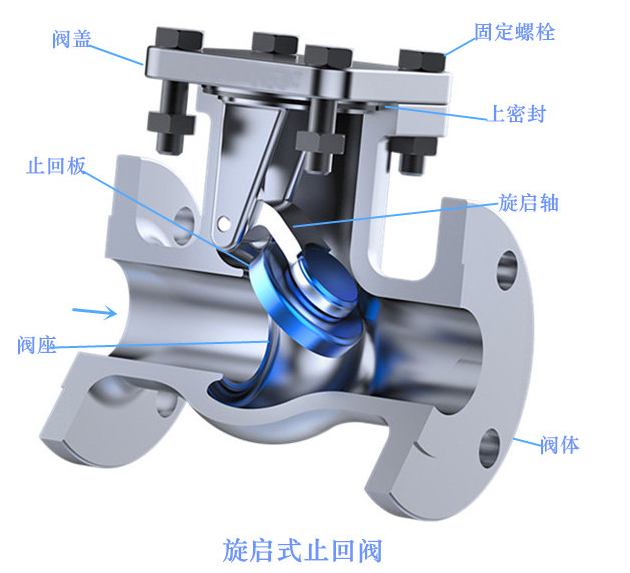 旋啓式止回閥又稱單向閥,結構形式爲單瓣旋啓式,正流是擋闆旋啓,逆流時擋坂降下壓住閥蓋,使逆向介質在閥門内被阻擋,又可稱逆流閥、逆止閥等。旋啓式止回閥屬於自動閥類,作用原理是隻允許介質往一個方向流動,防止介質逆流對前端泵或其他設備的損壞。