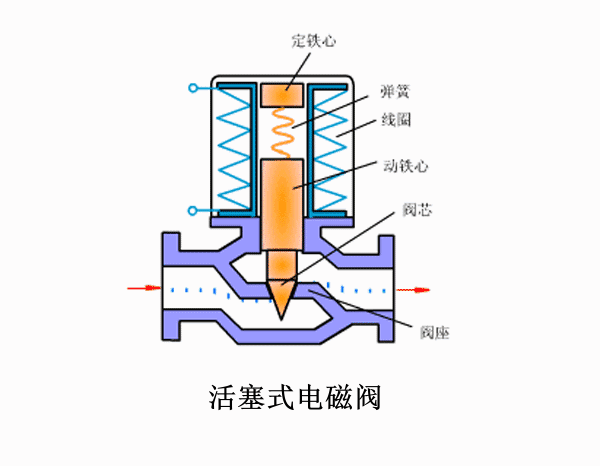 1)常閉型,通電時電磁線圈産生足夠的電磁力把運動部件(由磁芯、閥杆、上下部的膜片/密封件構成)從閥座上提起,閥門開啓;斷電時彈簧力把運動部件壓在閥座上,閥門關閉。