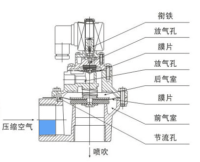 當電磁閥電磁線圈通電時,線圈激磁回路形成磁場並(bìng)産生磁力,活動鐵芯受電磁力的吸引克服瞭(le)自重與彈簧的阻力而上升。當工作壓力小於0.05Mpa時,活動鐵芯上移打開導閥直接拉動主閥口膜片,形成通路;當工作壓力大於0.05Mpa時,通過首先打開導閥,使膜片上下腔産生壓力差,膜片在差動力的作用下克服自重和閥芯彈簧而開啓随即主閥口全開,斷開電源時,導閥口在彈簧力的作用下關閉,閥芯膜片受向下的壓力而關閉主閥口,閥口斷流,電磁閥處於關閉狀态(常開閥與此相反)。