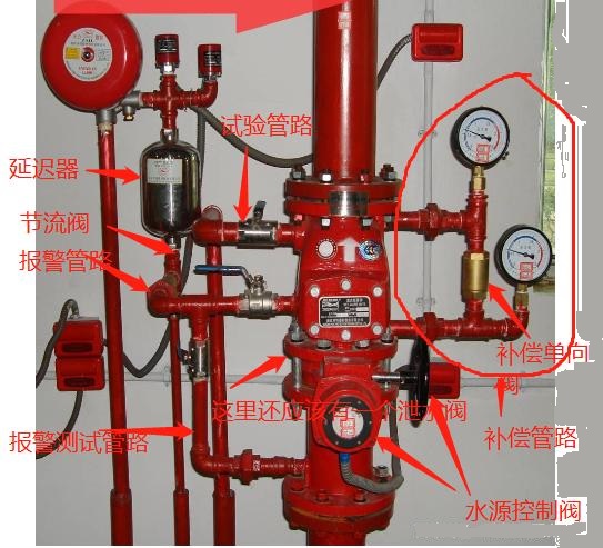 報(bào)警管路:接到閥體閥瓣處,閥瓣開啓才有水進入。報(bào)警管路上連接著(zhe)幾個重要的器件,控制閥、過濾器、延遲器與節流器(節流孔闆)、壓力開關、警鈴。