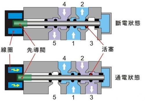 上圖中爲二位五通電(diàn)磁閥(fá)剖視圖
