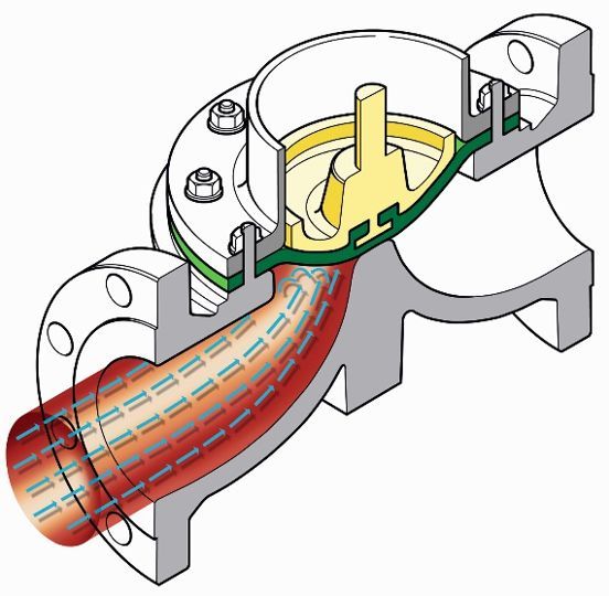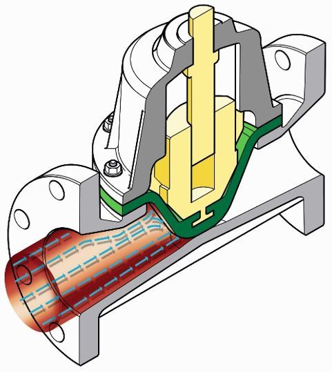 在隔膜閥中,有一個彈性的密封件“膜片”通過一個壓塊成形變,通過關閉(bì)過程中正反配合使其壓在閥體的密封堰上。壓塊通過主軸驅動,随著(zhe)執行機構上下動作。管道内的介質流将被限流或完全關閉(bì)。介質的流動方向是可以自由選擇的。