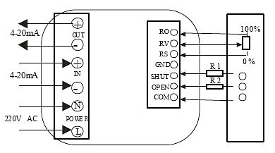 ![]() 開度式電(diàn)位計型,開關型帶(dài)開度式接線圖 | ![]() 智能調(diào)節(jié)式,輸入輸出4-20mA,智能調(diào)節(jié)型接線圖 |
